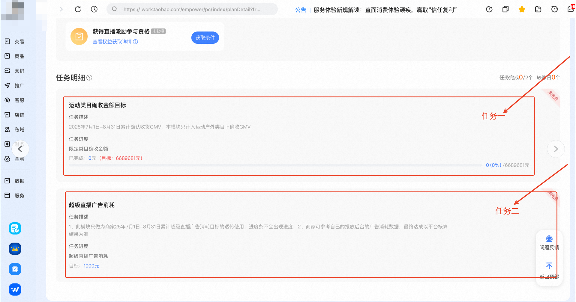 完成后台设定的两个必做任务后,即可参与进入打榜赛。我们将按照商家在7-8月的直播间确收成交金额金额排名,排名前20位的商家获得激励。