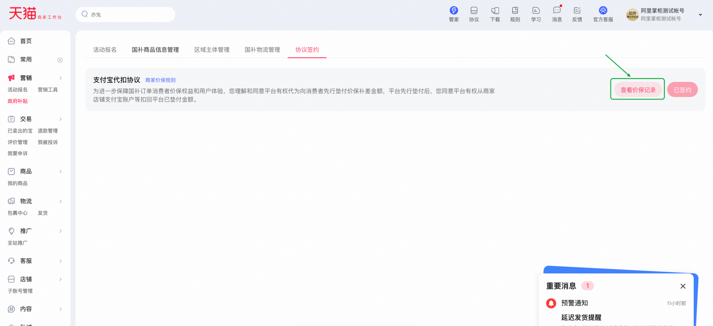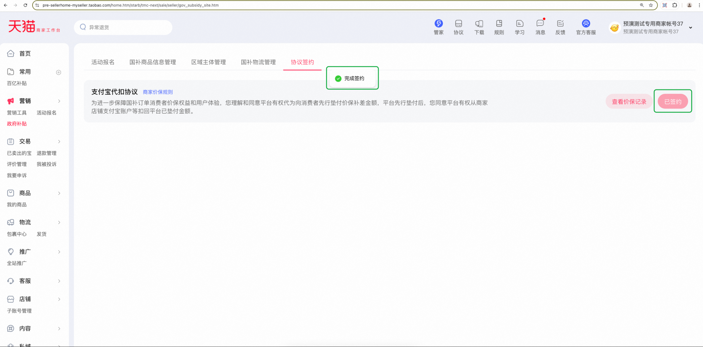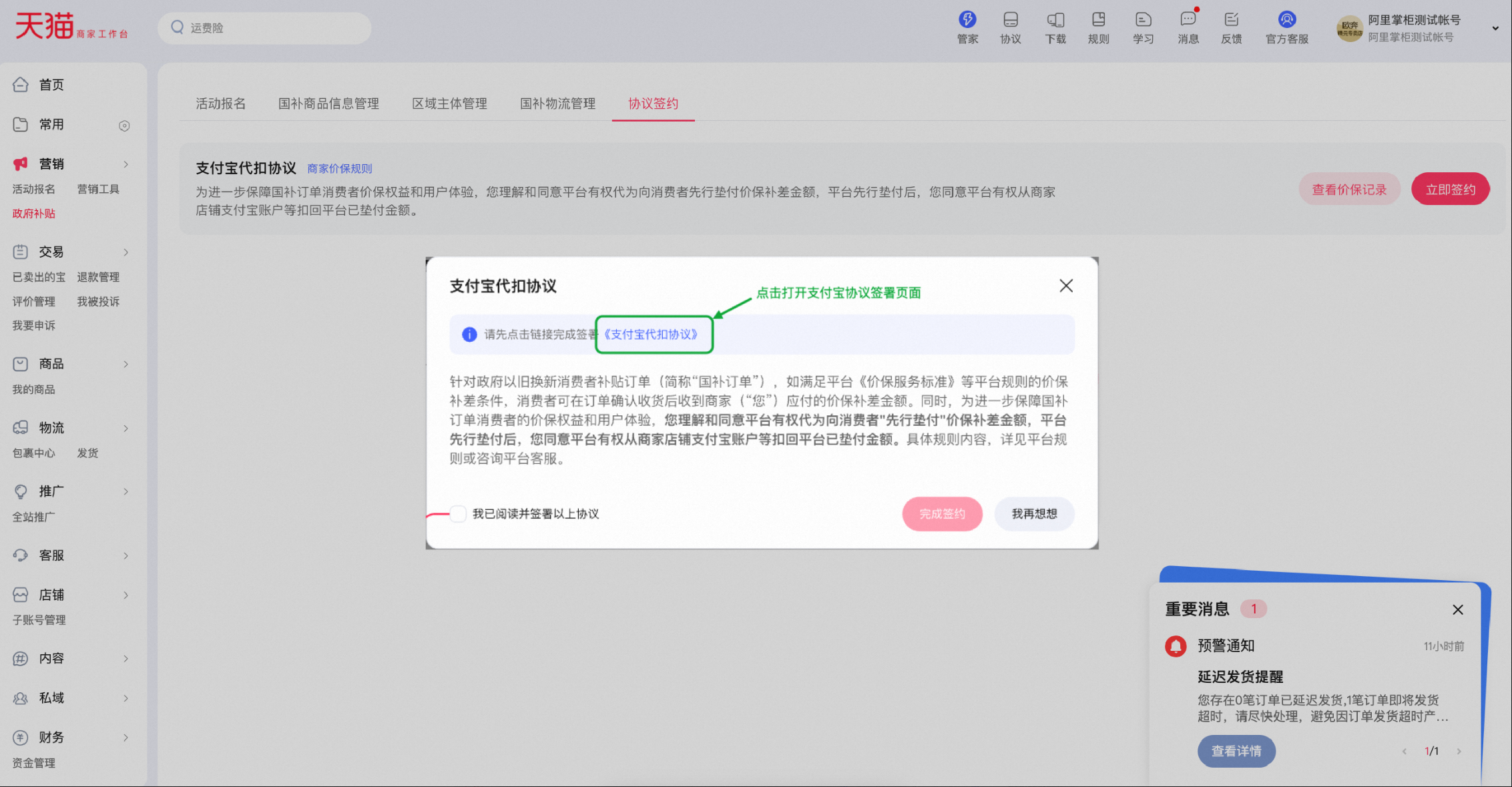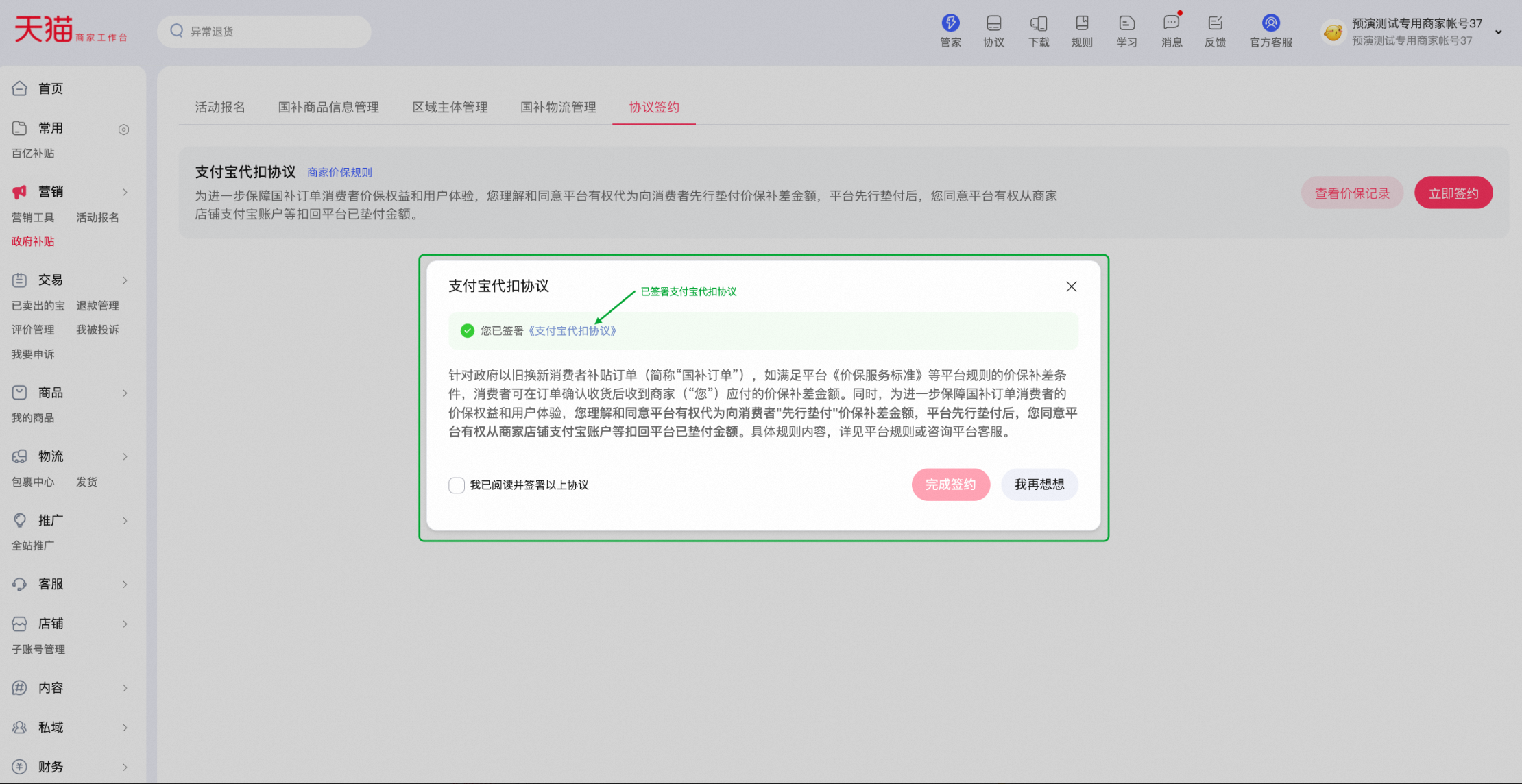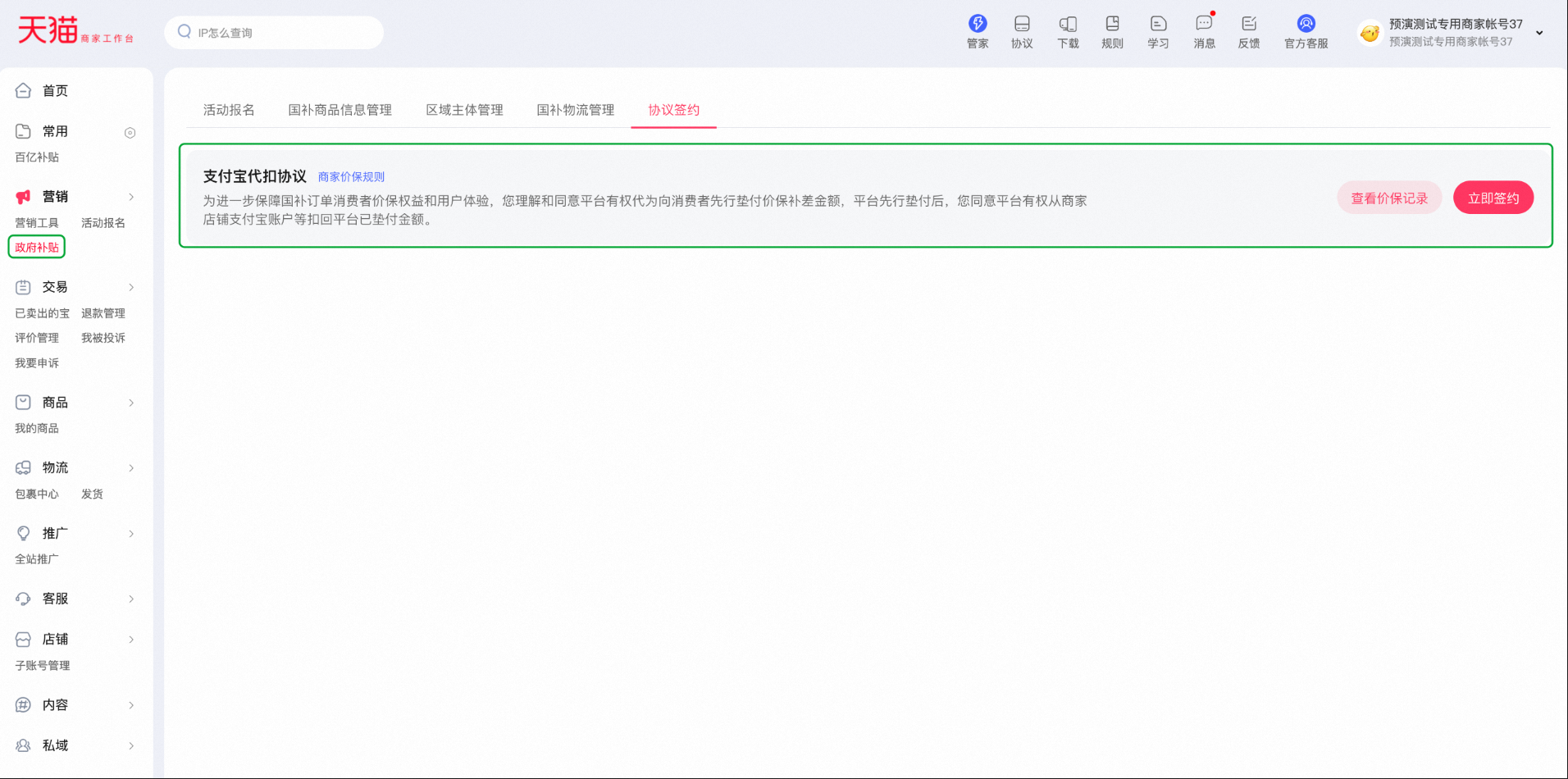2.1干牛-营销-政府补贴菜单,找到【支付宝代扣协议】签署模块