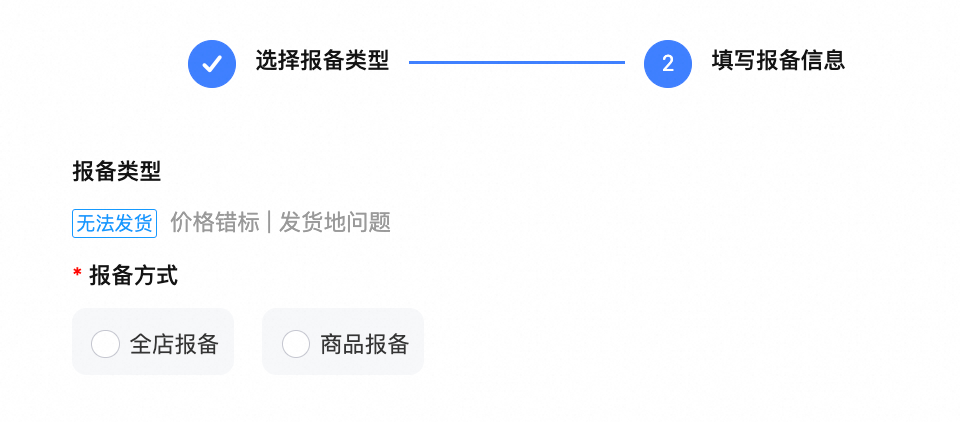 2 报备发起 根据判断是 店铺受影响 还是 部分商品受影响,选择不同方式的报备。