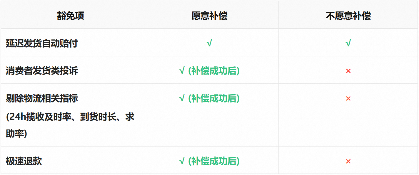 3 报备补偿 根据资损程度判断是否以补偿消费者的形式来解除订单合约。 愿意补偿 若报备通过,后续支持以小金额补偿形式来豁免发货类赔付、极速退款、剔除物流相关指标。