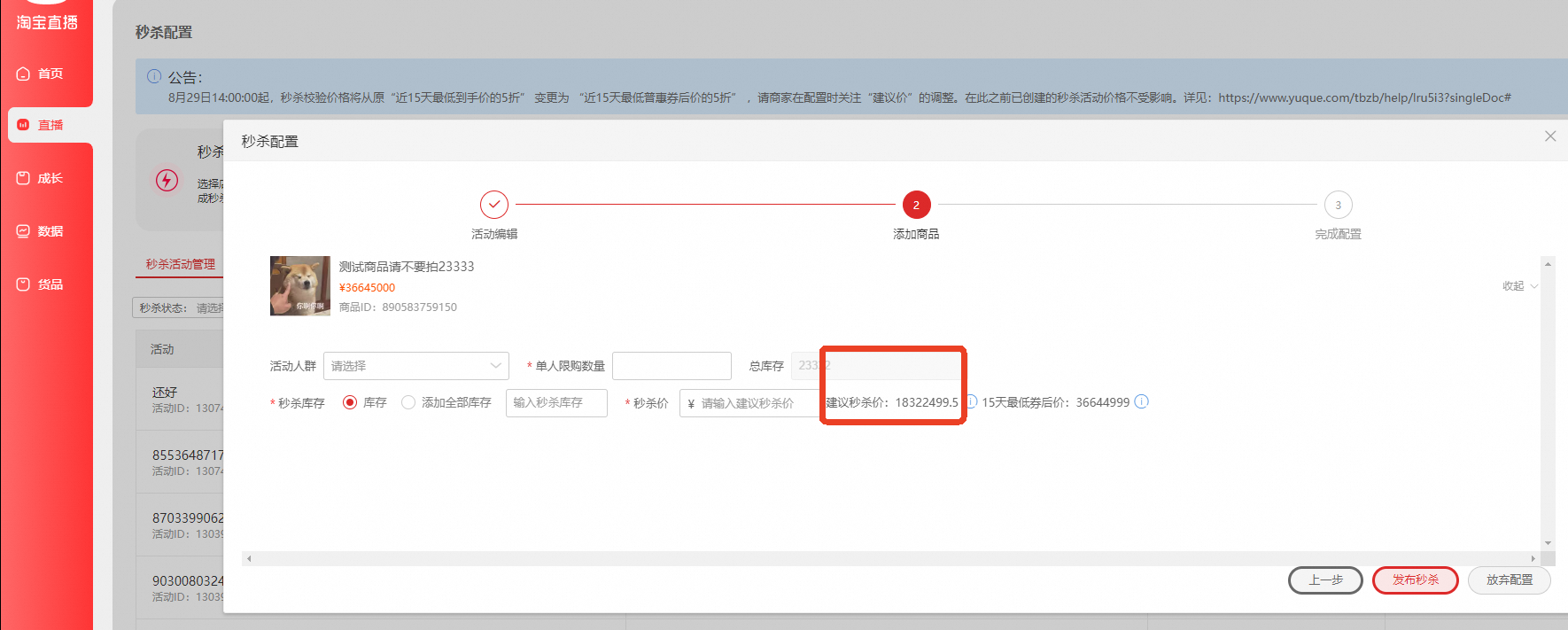 需在中控台配置商品ID、时间、限购数量等,确保活动期间库存充足。