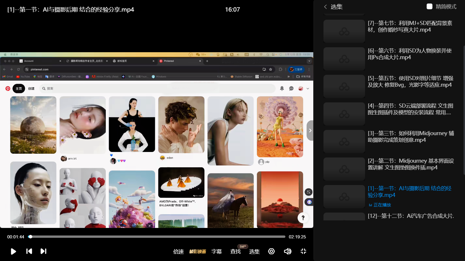 课程目录: [1]–第一节:Al与摄影后期结合的经验分享.mp4 [2]–第二节:Midjourney基本界面设置讲解文生图垫图换件插.mp4 [3]–第三节:如何利用Midjourney辅助摄影完成策划创意.mp4 [4]–第四节:SD云端部的安装流程常用.mp4 [5]–第五节:使用SD对图片细节增强及放大修复Bvg,光影宇等适应.mp4 [6]–第六节:利用SD为人物换装并使用Ps合成大片.mp4 [7]–第七节:利用MJ+SD匹配背長素材,创作婚纱写真大片.mp4 [8]–第八节:如何利用AI实现服装创意大片.mp4 [9]–第九节:Ai时尚杂志大片案例.mp4 [10]–笑十节:静物摄影中如何用A辅助制作场景道具.mp4 [11]–第十一节:利用AI模拟秀场走秀大片.mp4 [12]–第十二节:Ai汽车广告合成大片.mp4