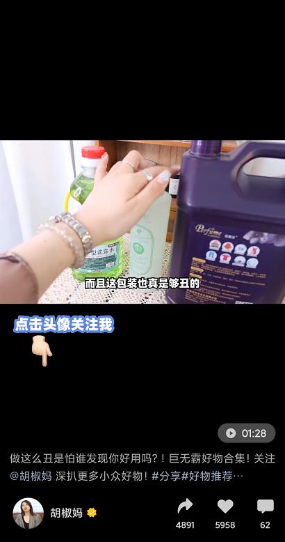 通过推荐一些好物分享,来刺激用户购买。比如视频号胡椒妈发布的一条视频“做这么丑是怕谁发现你好用吗?!巨无霸好物合集!”分享了国货好物。