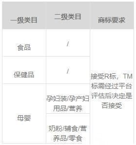 各类目入驻品牌境内商标要求:(不在此表内的类目视为同时接受TM标和R标)
