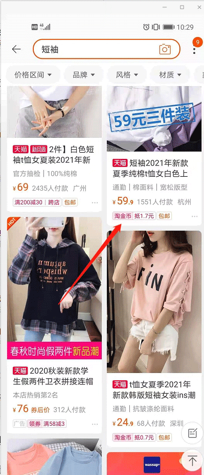 目前我们在手机淘宝上随便搜索一个关键词的时候,比如“短袖”,搜索出来后你看到一个橘黄色标签的金币抵几元这种,看下图有设置淘金币抵钱的宝贝排名甚至可以排在天猫店的前面。