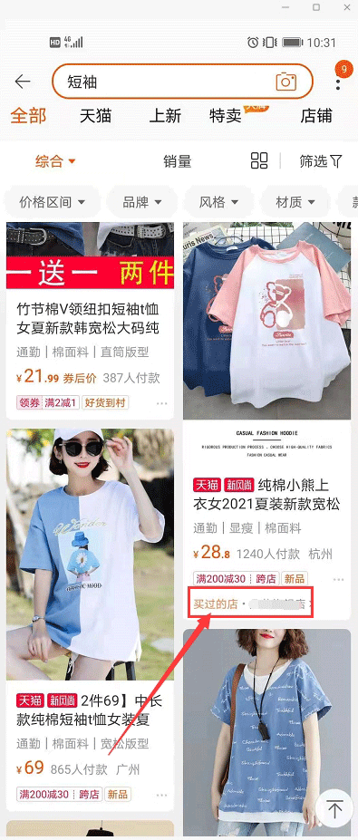 同样的道理,我们搜索一下“短袖”同样显示蓝色小标签“已省几元”这种手机专享价,这个也是手机淘宝比较重要的一个设置,现在C店只有部分店铺开放,商城是大多数店铺开放的。