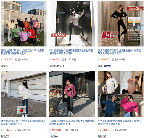 网红店铺多数以网红本人或签约模特为主的拍照风格,场景、地点、服装风格都根据网红本人的特点属性选择。