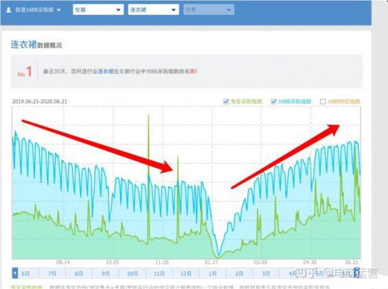 拿连衣裙来举例,3月份就开始涨,看去年的趋势是8月份开始急剧下滑,因为当时是4月初,所以知道这个类目合适,可以看到去年的4月份的一个涨势,所以是可以做的,其他几个类目一样的操作去验证。