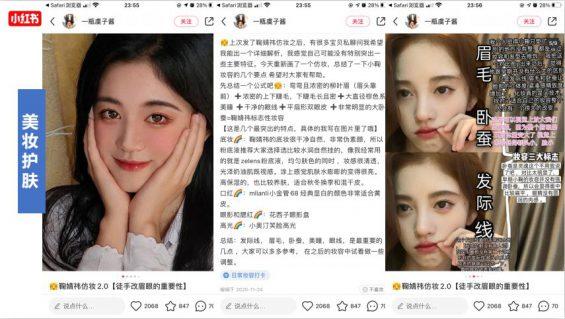 这里她写的是一个明星的仿妆,明星在前,其实这种叫做借助名人效应,她的标题是——徒手改眉眼的重要性。