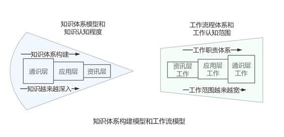 对照的,工作流的模型与知识体系模型对称:工作一开始接触的是业务细节及运作,逐步过渡到具体的方法论,最后是对通识层全局的把控。