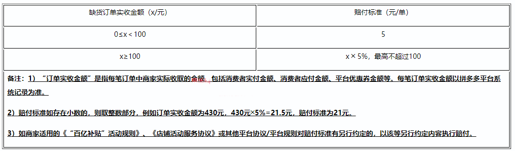 对于同城配送服务商品的缺货订单,拼多多平台有权从商家账户余额中扣收消费者赔付金,并以50年有效期的无门槛现金券形式发放给缺货订单所对应的消费者,同时有权关闭交易并对消费者进行退款。赔付标准如下: