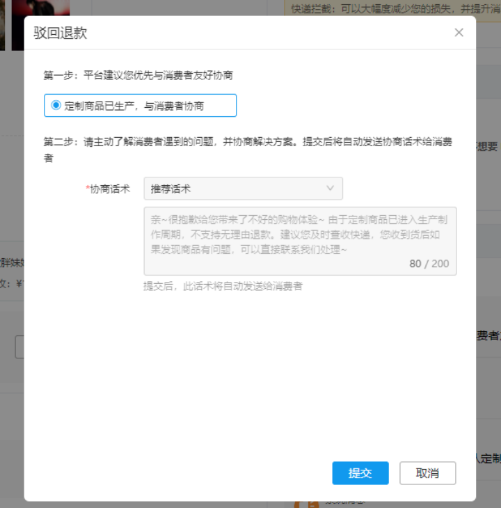(2)若定制商品还未发货,但已经进入生产流程,且已生产的商品不可再次销售,无法支持退款述求,选择【坚持驳回】按钮;