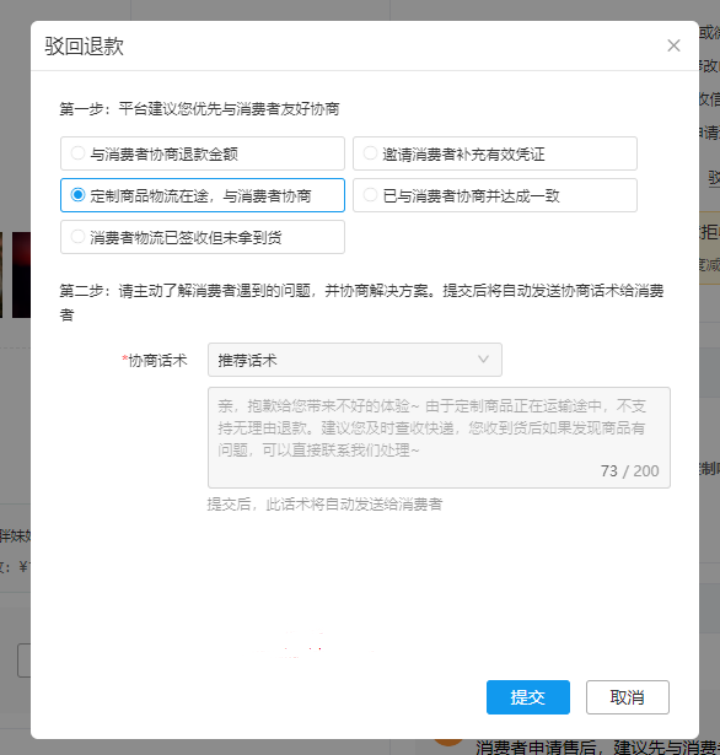 (3)在已和消费者进行充分沟通的前提下,若仍坚持驳回退款,可根据实际情况选择【因商品在途,与消费者协商】或【定制商品已签收,不支持无理由退款】进行驳回,驳回需要提交物流在途或已签收的物流凭证。