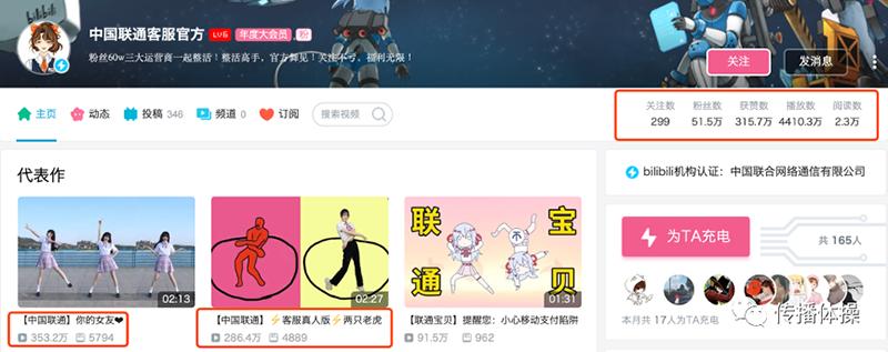 在“中国联通客服官方”主页设置的三大代表作中,均与舞蹈内容相关。一支是真人出镜JK制服舞蹈,一支是鬼畜向舞蹈,一只则翻新《爱杀宝贝》动漫的经典二次元舞。