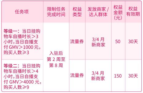 ·面向商家:面向完成1次直播带货开播时长≥2小时,1500元<近30日支付GMV≤15000元,且已开通店铺官方账号,商家体验分≥4.5或暂无体验分,3月1日-4月30日入驻的新商家。