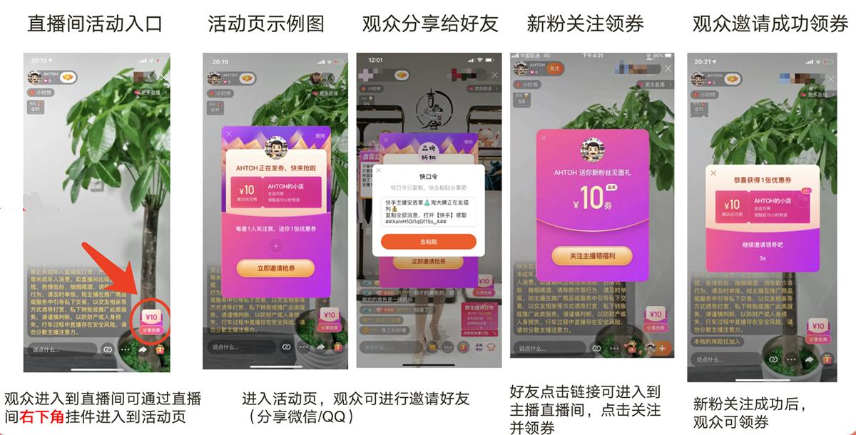 主播在直播间发放优惠券福利,发动粉丝邀请好友关注,新粉老粉同时获得优惠券。