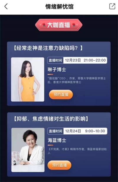 “酷炫脑”CEO ,作家,耶鲁大学博士后,香港大学博士琳子博士;湖南司法行政戒毒系统二级警长,临床心理医师刘骞等,多达30位行业专家,每天在「情绪解忧馆」开启数场直播,涵盖情绪管理、心理健康、儿童心理、社交心理等维度。