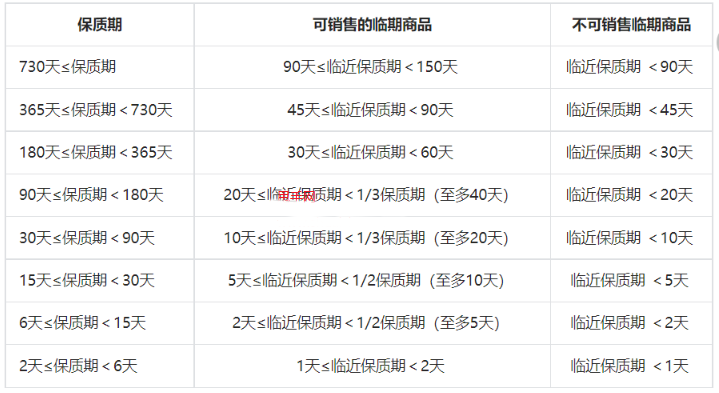 对于临近保质期的商品,根据所剩余时间的长短,分为“可销售临期商品”和“不可销售临期商品”两个部分,是否可销售的标准如下:详见 《【商品治理】商品保质期规范》