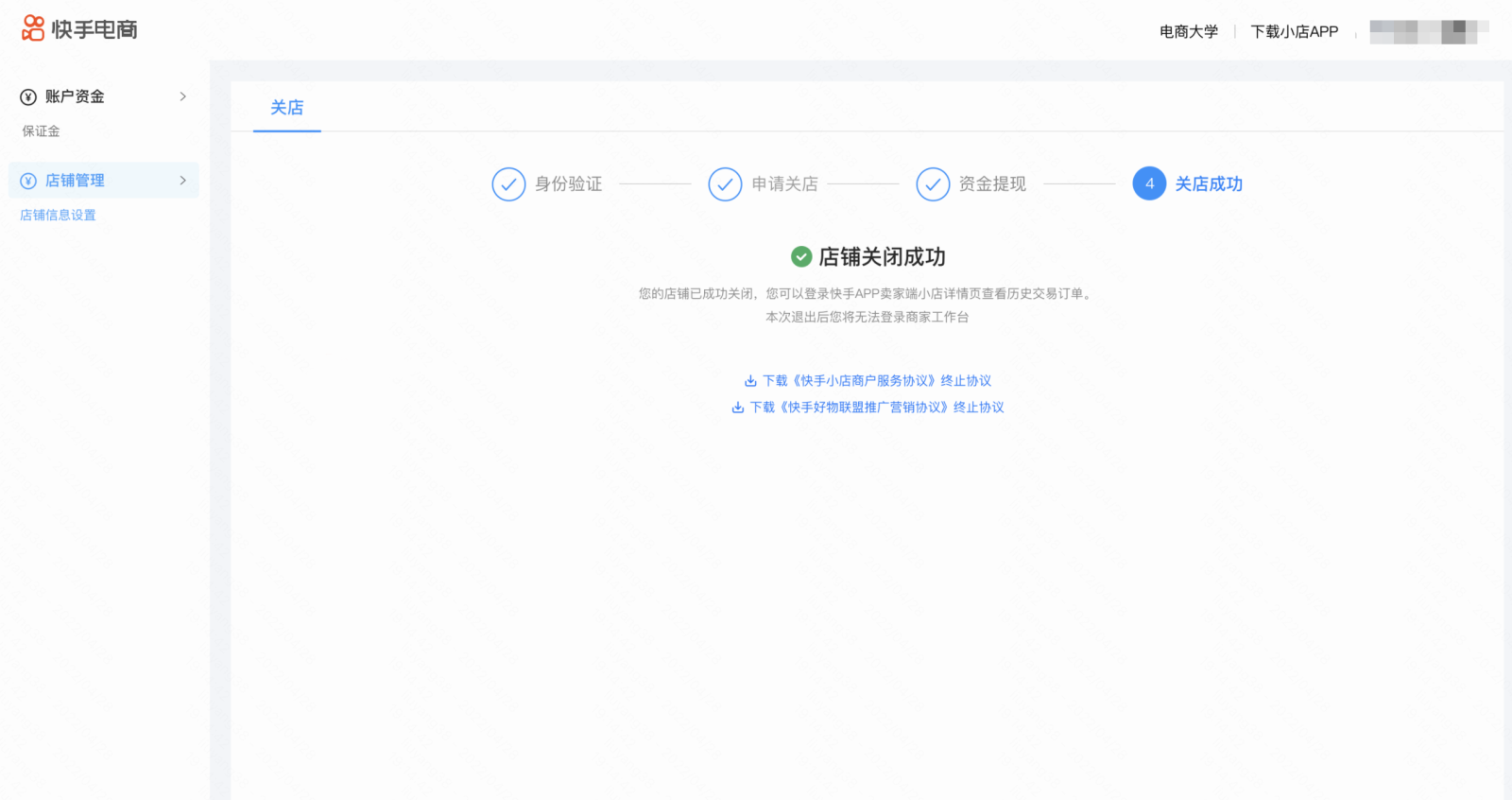 保证金余额到账成功后,点击【下一步】按钮,进入关店成功环节,此时店铺状态变更为“关店成功”
