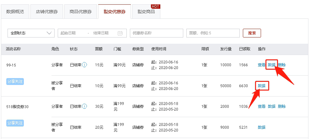 商家后台→营销中心→营销工具中心→优惠券→裂变优惠券→设置的活动→操作→数据