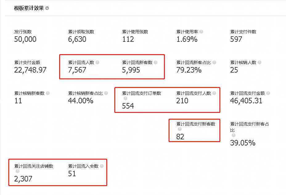 累计回流支付金额:累计回流人群(子券UV),当日进店支付的金额,只要支付就算,不一定要核销子券