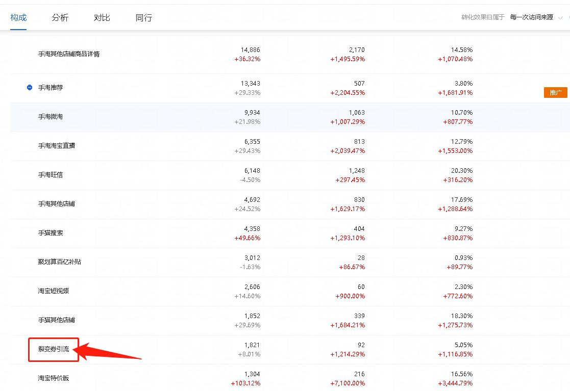 查看路径:生意参谋→流量→来源分析→店铺来源→构成→流量来源构成→流量来源→淘内免费→裂变券引流。