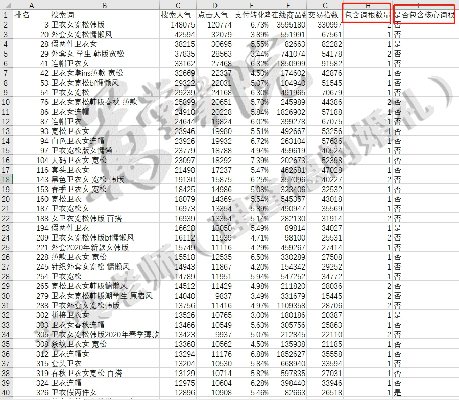需要注意的是:“是否包含核心词”一列中先把包含核心词的词筛选出来,根据数据决定用哪些词,包含词根数量越多,越精准。