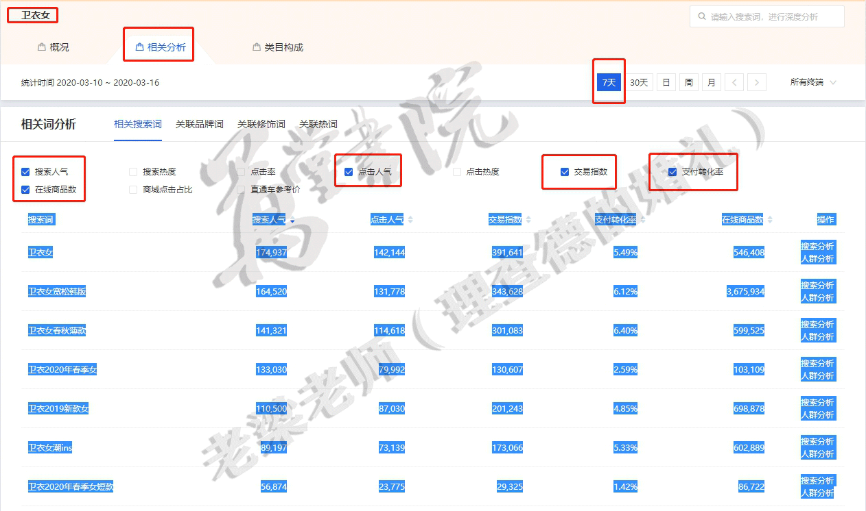 在搜索词排行里将跟自己需要的词点开后面的搜索分析,然后选择自己想要的5个数据维度,把全部数据下载下来,去除重复项并按搜索人气降序之后存为文件,然后再把文件中的冲突词去掉就变成了自己的一份店铺词表了(不想手工去冲突词的可以借助公众号的老梁搜索工具箱)