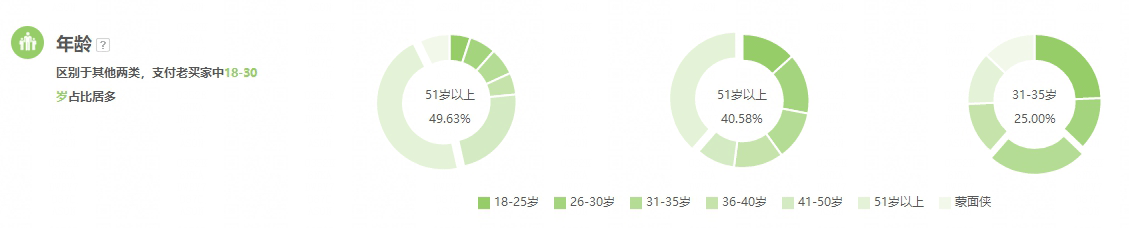 3 再来看新客,成交也主要是在51岁以上的人群上。再次说明店铺标签没有问题。需要注意的是,51岁人群中未支付人群49.63%,支付新买家51岁人群占40.58%。这说明什么? 转化不好,如果是在支付新买家比未支付买家的占比更高说明这个人群转化好,如果低了说明转化不好。
