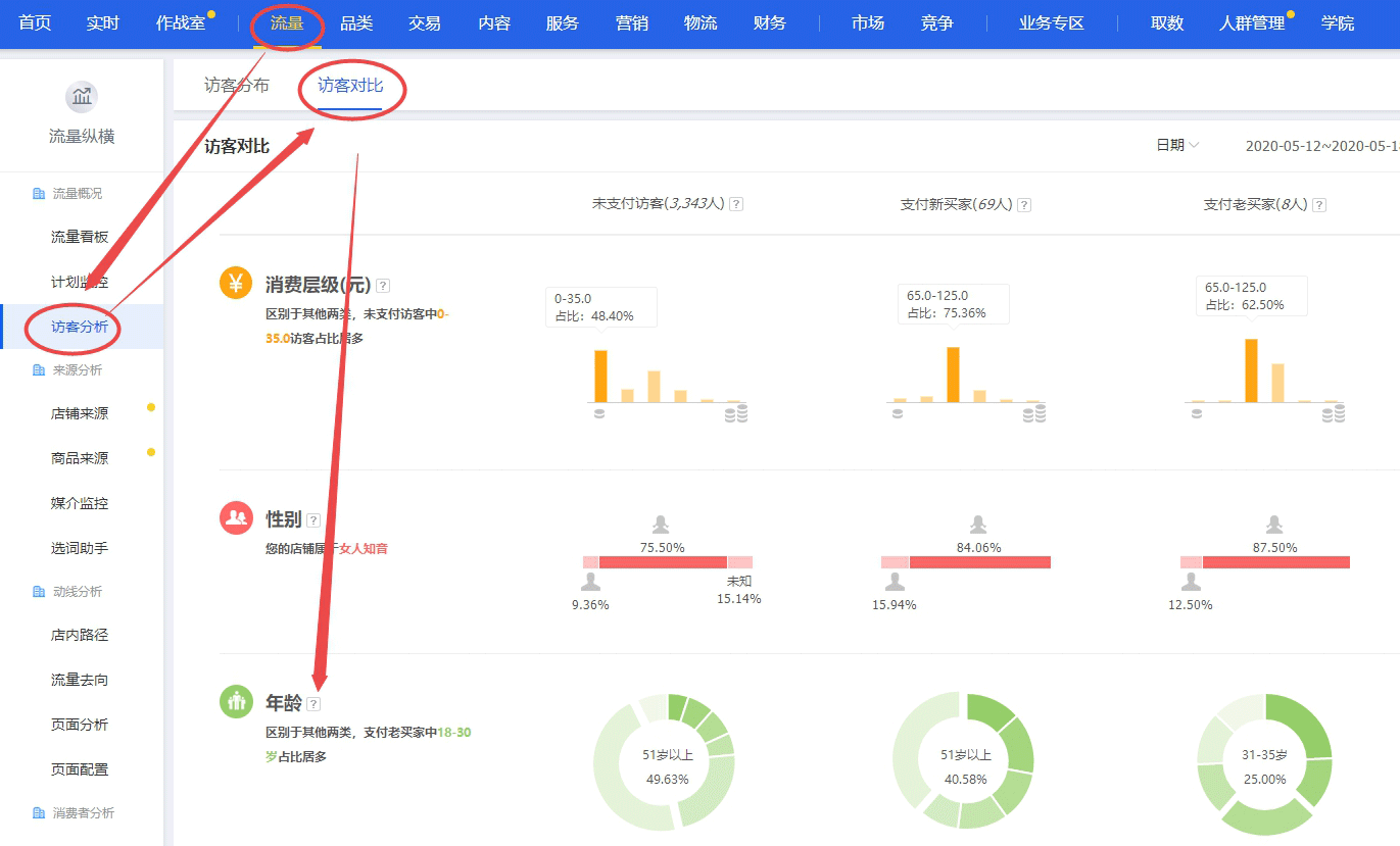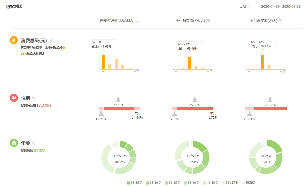 当担心店铺人群有问题的时候,别着急,先学着查看店铺人群的方法,通过生意参谋的“流量-访客分析-访客对比”,可以看到店铺人群的消费层级、性别、年龄、地域和营销偏好等特征,在这些特征里面,通过潜在客户往新客户的输送、新客户往老客户的输送情况,以及每类人群各自的占比升降情况,就可以看出人群结构是否合理。