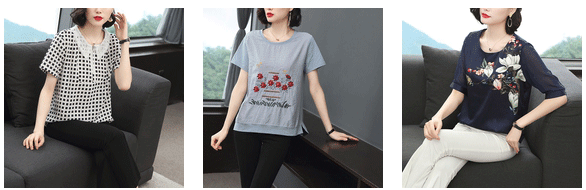 看看店铺中的商品。我个人认为,店铺人群精准得益于产品。衣服的款式真的很中老年。问题在于模特,模特从妆容、身材、发型看起来就很不中老年。买家没有代入感,这就是影响到了转化的原因。商家显然也意识到这个问题,所以把模特的脸裁掉,只露出半截。