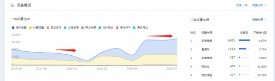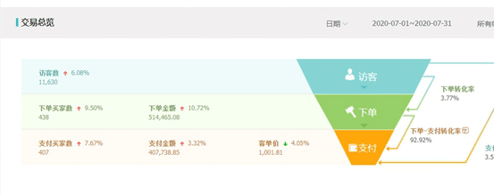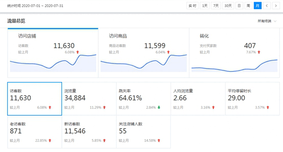 在看一下我们7月份的数据,已经从4月份慢慢的提高上来,包括我们的访客——浏览量——停留时长等,那么同时很明显就能知道,我们店铺的成交额肯定提升了很多,那么看一下: