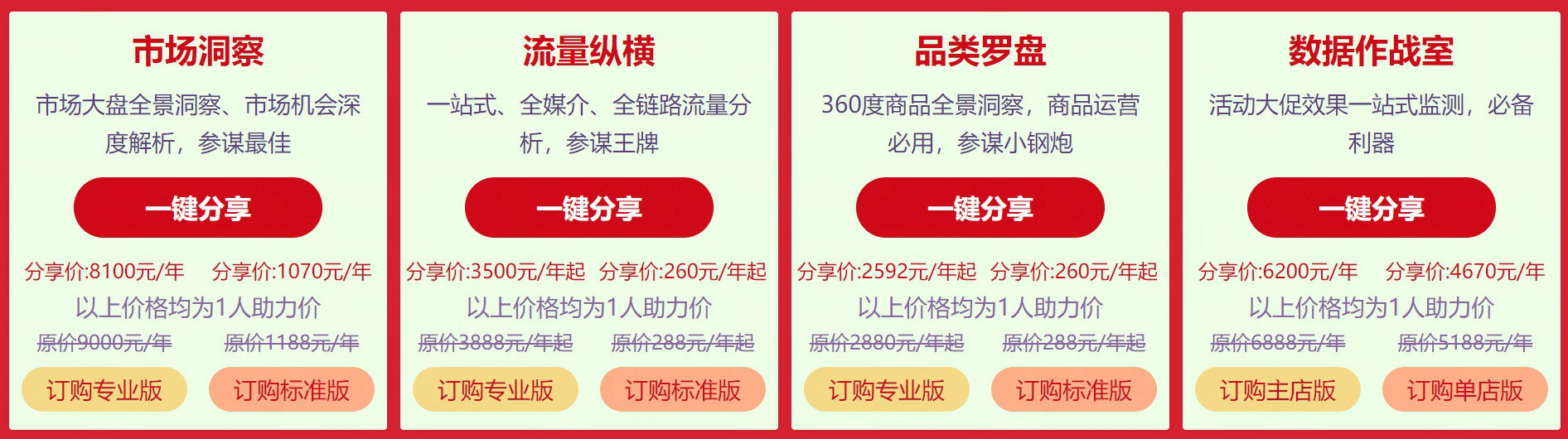 生意参谋的流量纵横、市场洞察、品类罗盘,都分别有标准版和专业版,不同版本对应的功能和价格也有区别。如何在保证不多花钱的前提下,满足自己店铺的数据需求?