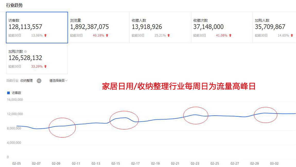课程以家居日用行业举例,我们首先通过生意参谋-行业趋势这个工具来分析一下整个类目大盘的流量特征,结合行业经验,来确定每周日是这个行业流量高峰日;