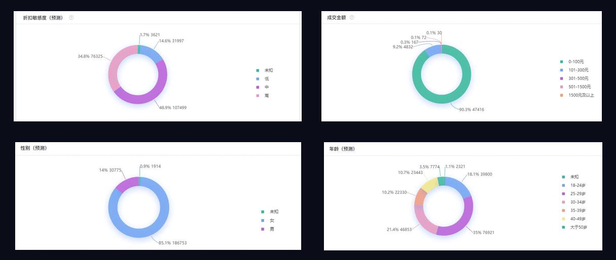 进一步分析人群特征,可以看出店铺绝大部分成交客户是女性,年龄18-34岁,客单价100元以内,且偏爱折扣;那么定向发放优惠券则可以刺激成交转化。