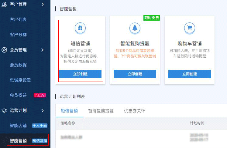 进入客户运营平台--智能营销,里面罗列的工具操作方式基本类似;以“短信营销”举例,点击创建运营计划;