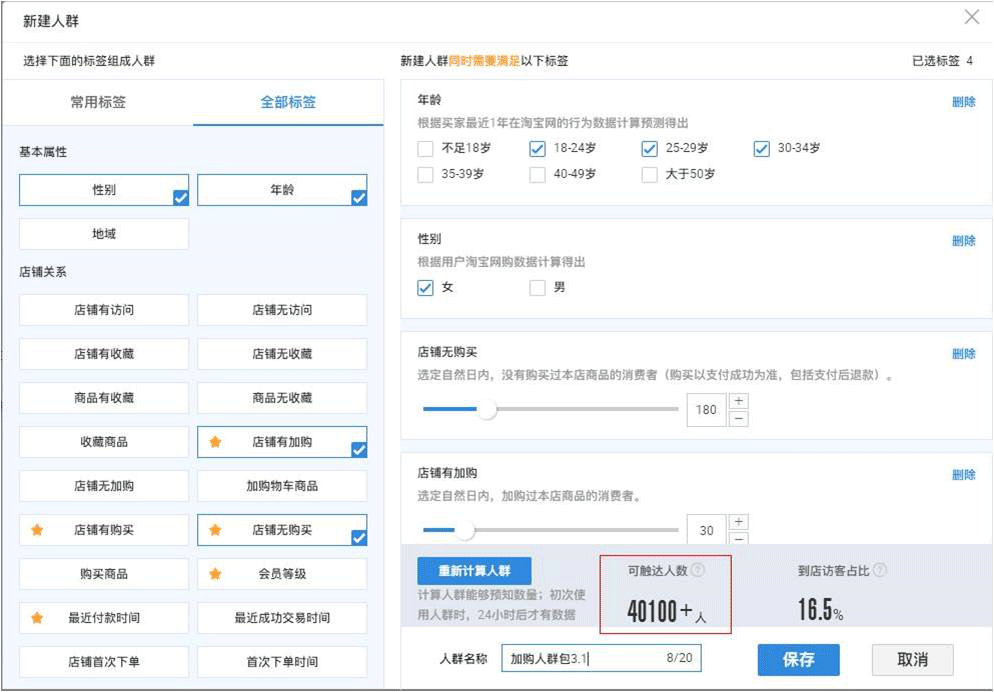 根据前面分析的店铺人群特征来组合人群包,比如下面案例中的“加购人群包”,经过系统计算,可触达人群有40100+,这个数字每天都会自动计算一遍
