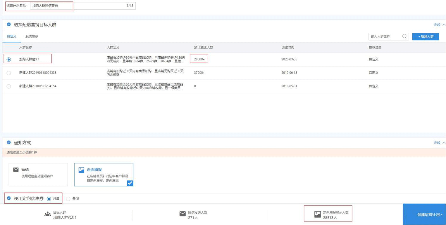 投放人群包创建好后,选择下面的“定向海报”和 开启“使用定向优惠券”,以便进一步针对投放人群创建优惠券;(短信因为需要充值,咱们就以免费的定向海报举例)