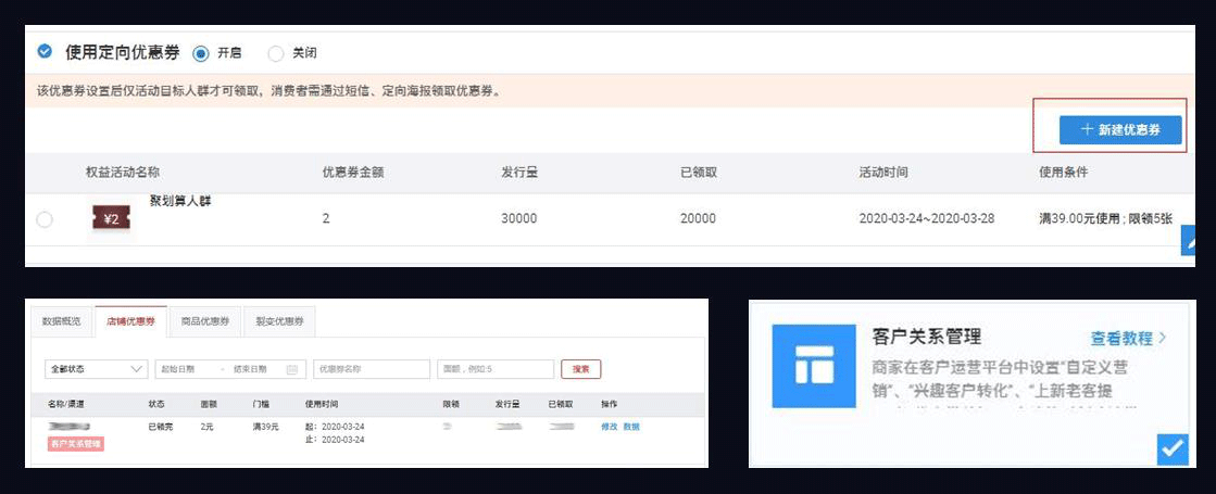 接下来点击右侧按钮来新建优惠券,或者是选择已经通过客户关系管理渠道创建过的优惠券。