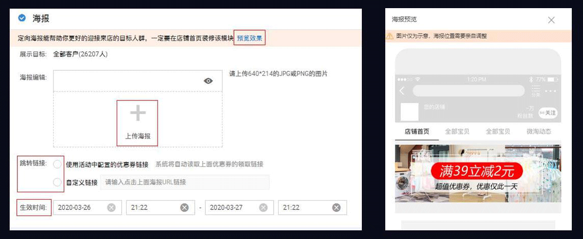 优惠券设置完成后,接着进行定向海报的相关设置;跳转链接可以按需要自行选择;还可以预览海报效果。