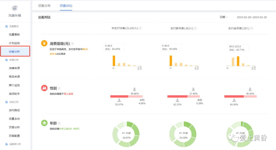 我们可以看到生意参谋的访客分析里:有访客分布和访客对比,这就相当于一个访客基础人群标签。
