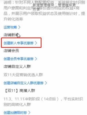 ④若无新客优惠券则点击“创建新人专享优惠券”进入优惠券创建页面