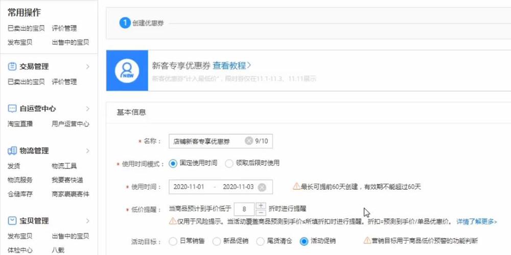 ②创建活动名称以及优惠券使用时间(双十一期间建议1、2、3、11日四天)