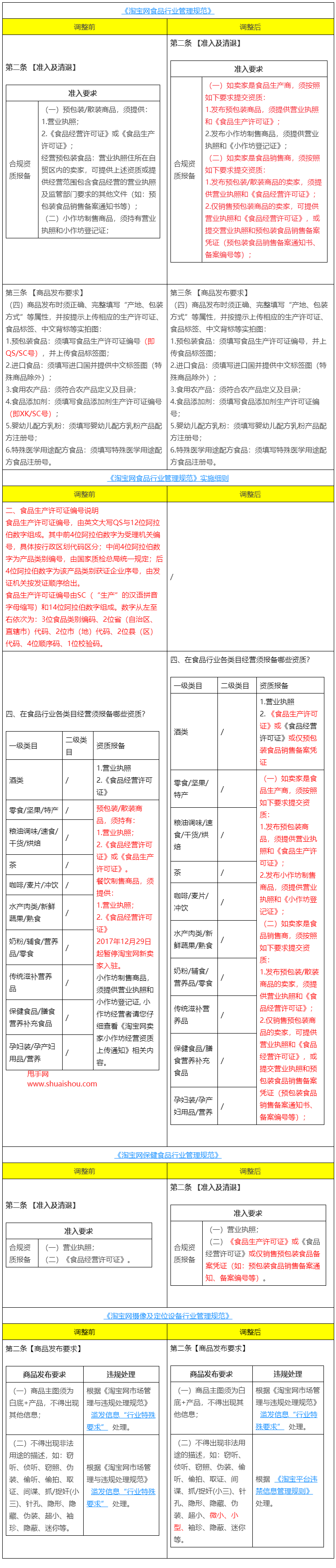 为了更好的促进行业发展,规范市场秩序,淘宝网拟调整《淘宝网食品行业管理规范》、《淘宝网保健食品行业管理规范》和《淘宝网摄像及定位追踪设备行业管理规范》。具体变更规则详情如下: