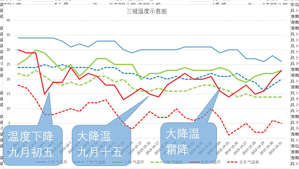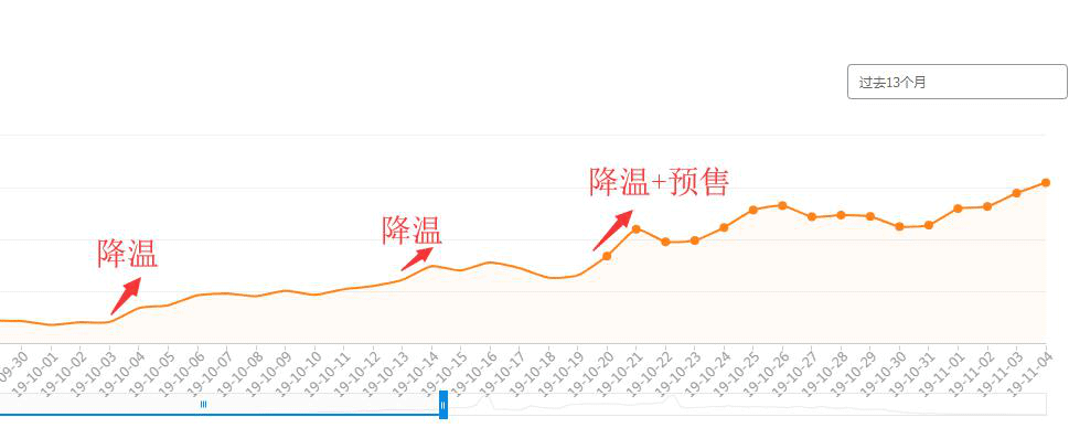 下图是特别取的羽绒服数据,来源是直通车后台流量解析,以及天气后报数据。2019年直通车流量解析中的关键词【羽绒服】的展现指数。可见(放大图片观看)10月份的三个增长点都与降温有直接关系。