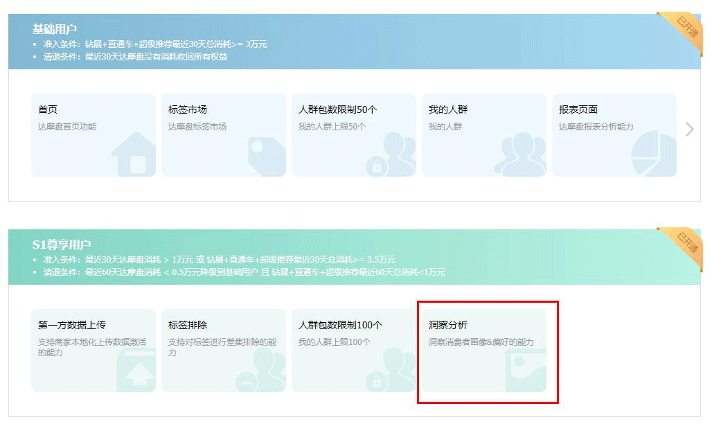 我们换一个思维就是只要用达摩盘分析一下买我们家的东西有什么人群特征。我们用到的工具是达摩盘的“洞察分析”,是一个s1的用户权益。