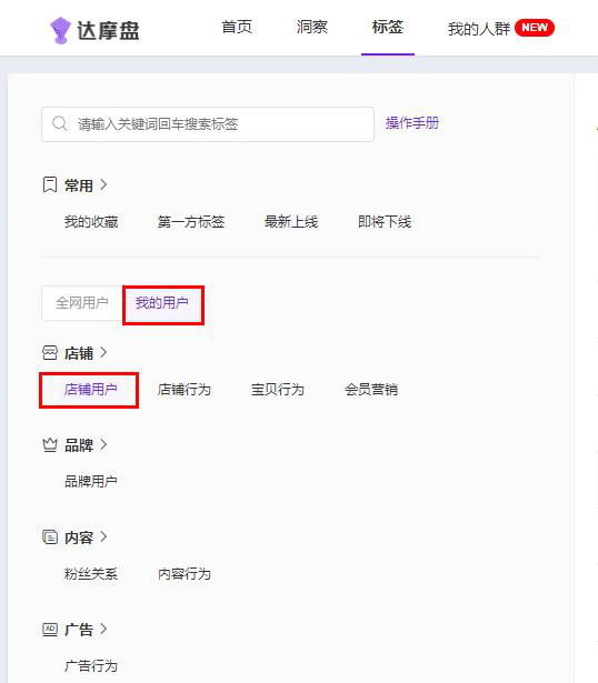 我们在达摩盘标签标签选项里面找我的用户-店铺用户