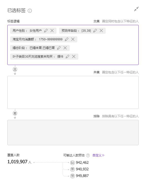 那我们这里圈选的人群是非常多的,这个人群基数对我们广告投放范围太大了,我们可以用前面我们洞察的精准人群,做交集,就是在里面找符合我们刚刚洞察的显著特征的标签。