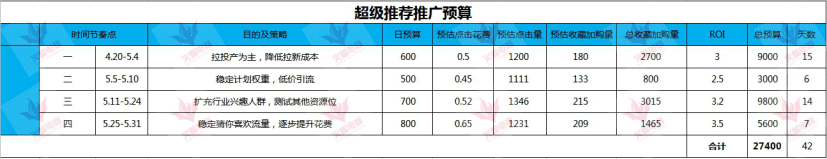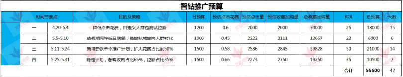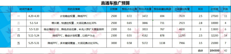 根据推广预算表格,按照推广节奏步步推进,其中在直通车上面是做为5个节点去操作的,分别为权重稳定期、权重增长期、计划稳定期、投产提升期、多关键词覆盖期,最终实现打爆单品的目标。