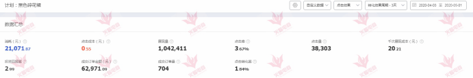 从4月3号上新到5月1号29天的时间,通过付费推广工具+内容营销的结合(直钻超+微淘直播),在计划的四个周期内,已经完成了爆款的打造。取得了最近30天本店排名销量第一名的好成绩。日销36000+,日流量14000+,累计直通车花费45000+。